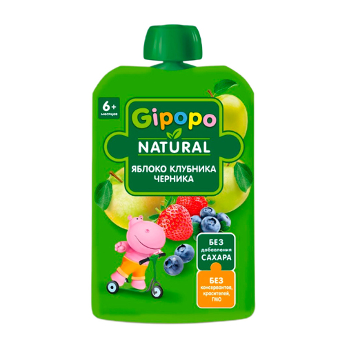 Пюре яблочное, пюре клубничное, пюре черничное, сок яблочный концентрированный, вода питьевая. Без добавления сахара. Содержат сахара природного (естественного) происхождения.