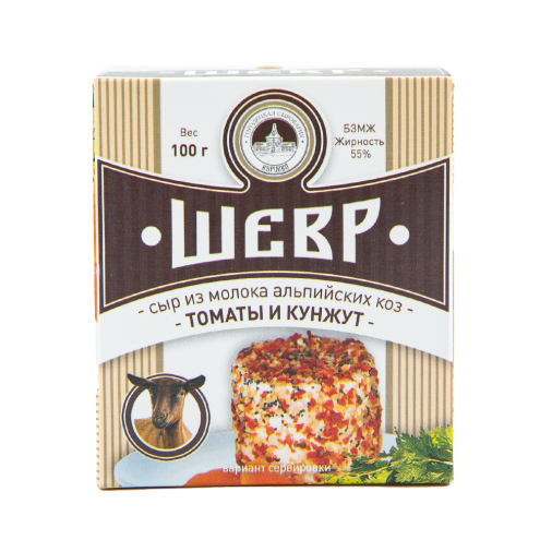Шевр Томаты и кунжут — мягкий сыр из молока альпийских коз. Он обладает пряным вкусом и ароматом специй: сушеного томата, кунжута, мака и лука шалот. Вкус и запах: молочнокислый, умеренно-соленый, допускается слегка кисловатый вкус и аромат, свойственный козьему молоку с привкусом прованских трав.