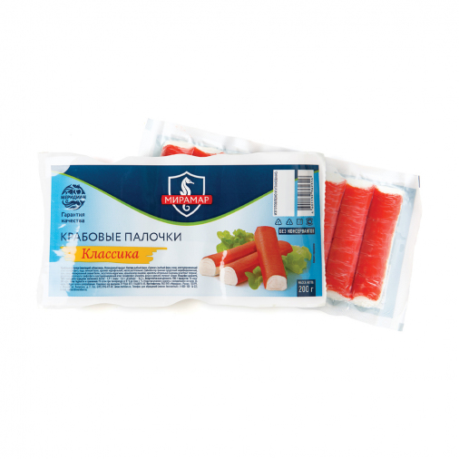 Фарш рыбный сурими (рыбный фарш, подсластитель сорбит, сахар, влагоудерживающий агент полифосфат), вода, яичный белок, картофельный крахмал, масло растительное, сахар, соль, ароматизатор "Краб" (идентичный натуральному), усилитель вкуса и аромата Е-621, каррагинан, натуральные красители Е-120, Е-160с, консервант Е-202.