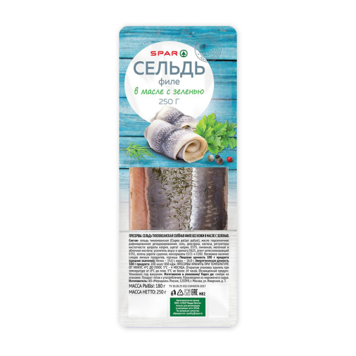 Сельдь тихоокеанская (Clupea pallasi pallasi), масло подсолнечное рафинированное дезодорированное, соль, декстроза, лактоза, регуляторы кислотности: цитраты натрия, ацетат натрия, Е575, лимонная, молочная и яблочная кислоты; усилитель вкуса и аромата Е621, агент антислеживающий Е551, зелень укропа сушеная, консерванты Е211 и Е202. Возможно наличие следов яичных продуктов, горчицы.