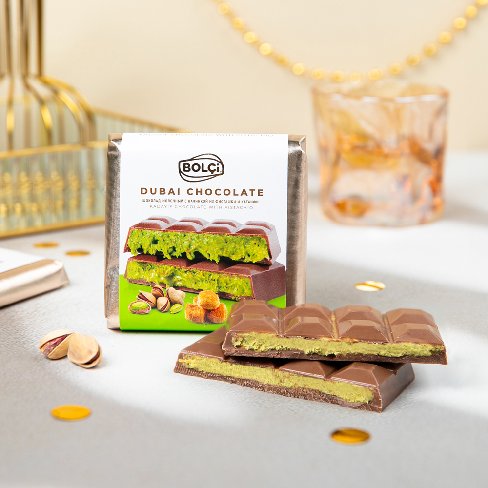 Шоколад молочный Bolci с начинкой из фисташки и кадаифа — это уникальное сладкое угощение, которое сочетает в себе мягкость и нежность молочного шоколада с богатым вкусом фисташек и хрустящей текстурой кадаифа. Это лакомство не только порадует вас и ваших близких с чашкой ароматного кофе или чая, но и станет настоящим гастрономическим открытием.