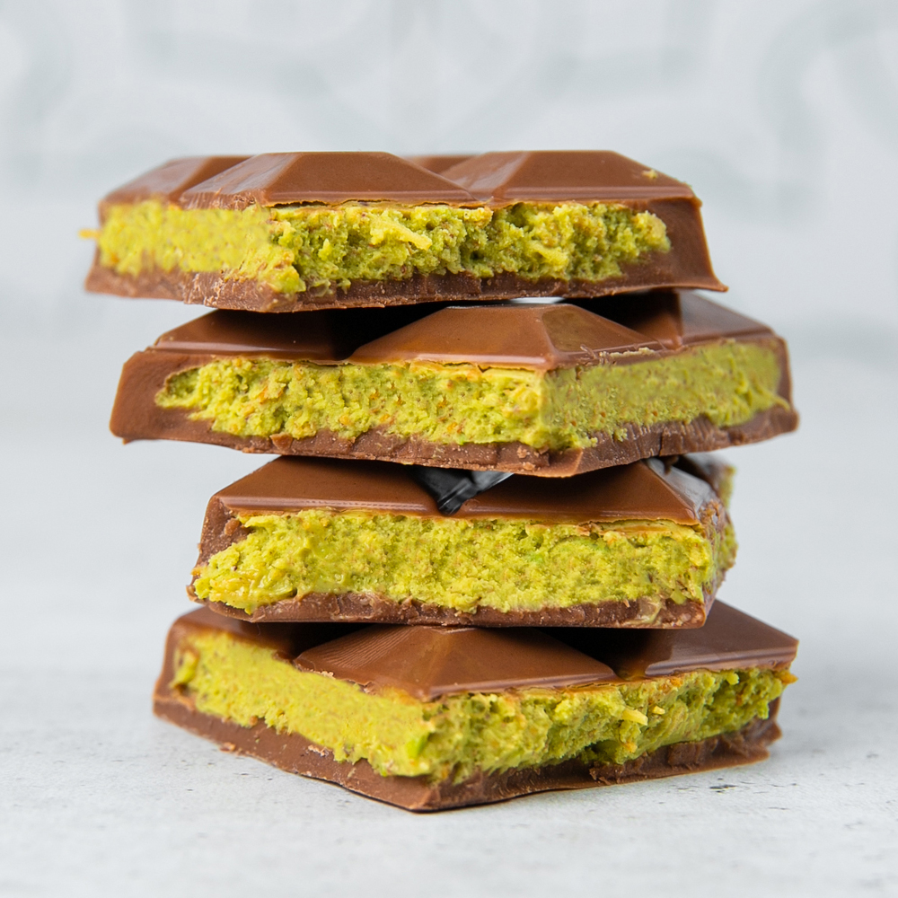 Сахар, фисташки (13%), цельное сухое молоко, смесь растительных масел (масло пальмовое, масло ши, масло салового дерева, масло иллипе, масло кокум), какао-масло, какао тертое, обезжиренное сухое молоко, жареный кадаиф (пшеничная мука, вода, соль), сыворотка молочная сухая, эмульгатор (лецитин подсолнечника, полиглицерин полирицинолеат), ароматизатор (ванилин). Содержание сухого остатка какао в молочном шоколаде: мин. 30%. Может содержать следы орехов, яиц, сои, арахиса, горчицы, кунжута и продукты их переработки.