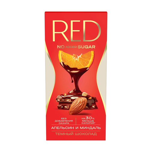 Какао-тертое; мальтит (подсластитель); полидекстроза (наполнитель); масло какао; дробленый миндаль 2%; цедра апельсина 1%; эмульгаторы: лецитин соевый, Е476; ароматизаторы.