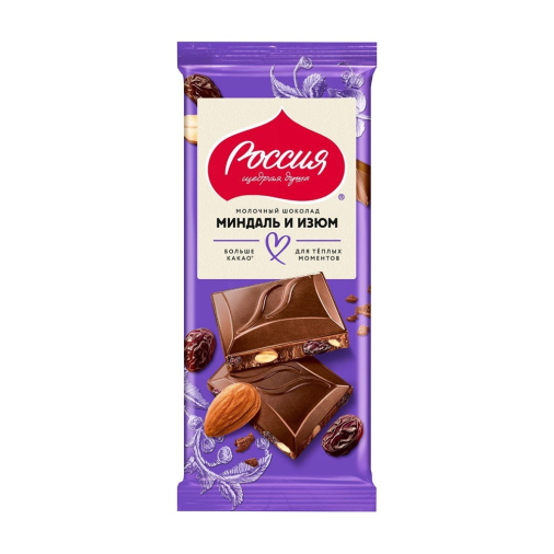 Это вкусный молочный шоколад с добавлением натурального миндаля и изюма. Продукт изготовлен из высококачественных ингредиентов, обладает насыщенным вкусом и ароматом. Может стать отличным дополнением к чаепитию или перекусу.