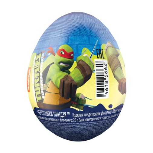"С удовольствием представляем новый продукт в лицензии для мальчиков «Черепашки ниндзя» – яйца с сюрпризом. Продукт выполнен из вкуснейшей высококачественной кондитерской глазури на фабрике в городе Иваново. Внутри каждого яйца ребенок найдет один из четырех видов сюрпризов. Дети с удовольствием будут собирать коллекции из крутых металлических жетонов, значков, насадок для карандашей и пряжек для шнурков с изображениями героев и символами фильма. Все фигурки коллекции изготовлены в соответствии с требованиями регламента «О безопасности игрушек».