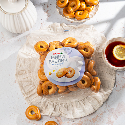 Мини-бублик молочный — это идеальный выбор для уютного чаепития или перекуса в любое время дня. Нежный вкус свежего молока делает его подходящим дополнением к чашке горячего кофе или ароматного чая. Прекрасно подойдёт как основа для домашних десертов и станет изюминкой при сервировке стола.