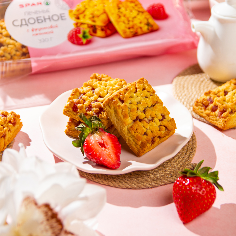 Смотрите, какое аппетитное золотистое печенье можно приобрести в SPAR! Вкусное, мягкое лакомство с прослойкой из малинового джема для вашего уютного чаепития и для угощения маленьких сластен. Наслаждайтесь, только постарайтесь не съесть всю пачку сразу!