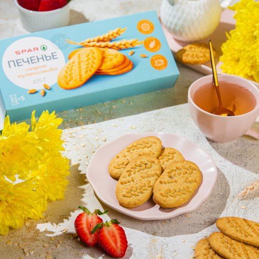 Сахарное мультизлаковое печенье SPAR — это вкусное и питательное угощение, которое станет отличным дополнением к чашке ароматного кофе или чая. Оно также прекрасно подойдёт для перекуса в любое время дня. Попробуйте его в качестве ингредиента для домашних десертов или используйте для приготовления канапе и сладких бутербродов.