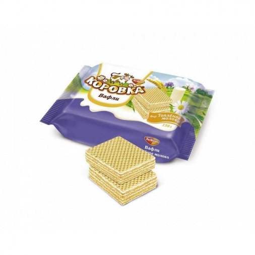 Ароматные неглазированные вафли Коровка, пластинки которых перемежаются с нежной прослойкой из сливочной кремово-помадной начинки. Крупные слоеные квадраты, насыщенный аромат топленого молока, сладкий сливочный вкус и воздушная текстура тонких хрустящих вафель.