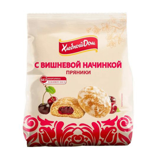 Сахар, начинка вишневая (сахар, вишня протертая, яблоки протертые, загустители: пектины, E1442, регулятор кислотности – лимоннаякислота, консервант – сорбиновая кислота, ароматизатор вишня), мука пшеничная хлебопекарная первого сорта, мука пшеничнаяхлебопекарная второго сорта, вода питьевая, патока, масло подсолнечное высокоолеиновое рафинированное дезодорированное,разрыхлители: гидрокарбонат аммония, гидрокарбонат натрия, пряности: корица, гвоздика, перец душистый, кориандр, перец черный,регулятор кислотности – лимонная кислота, ароматизатор натуральный. Продукт может содержать следы сои и консервант диоксид серы.
