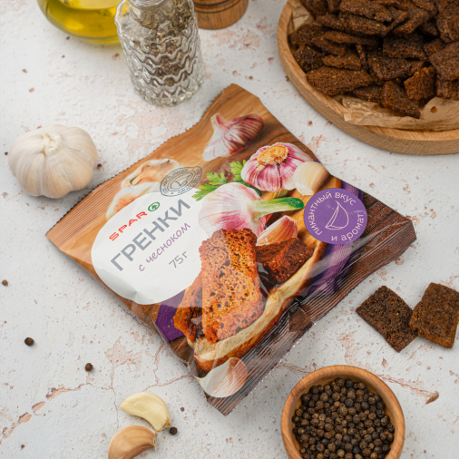 Хлеб ржано-пшеничный (ржаная хлебопекарная мука обдирная, вода, пшеничная хлебопекарная мука первого сорта, солод ржаной ферментированный дрожжи хлебопекарные, соль), масло растительное (подсолнечное рафинированное дезодорированное), комплексная пищевая добавка: «Чеснок с зеленью» (мальтодекстрин, чеснок сушёный в гранулах, соль, подсластитель – декстроза, усилитель вкуса и аромата глутамат натрия 1-замещенный, паприка красная молотая, натуральный экстракт чеснока, зелень петрушки сушёная, регулятор кислотности – диацетат натрия, агент антислеживающий – диоксид кремния).