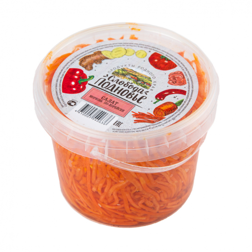 Морковь свежая, масло подсолнечное, вода, соль, комплексная пищевая добавка смесь подсластителей (ацесульфам калия, цикламат натрия, сахаринат натрия), чеснок, регулятор кислотности: уксусная кислота , усилитель вкуса и аромата: глутамат натрия, семя кунжута, кориандр, перец красный острый молотый, консервант: сорбиновая кислота. Возможно наличие следов арахиса и сои.