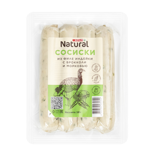 Вкусно, когда натурально! Сосиски SPAR Natural из мяса птицы отличаются низким содержанием соли и высоким процентом белка. Без вредных добавок, только специи и мясо, 100% натуральный состав. Сочетание свежей моркови и сочной брокколи с нежной индейкой делает сосиски подходящими для диетического питания. Полезный продукт для всей семьи!