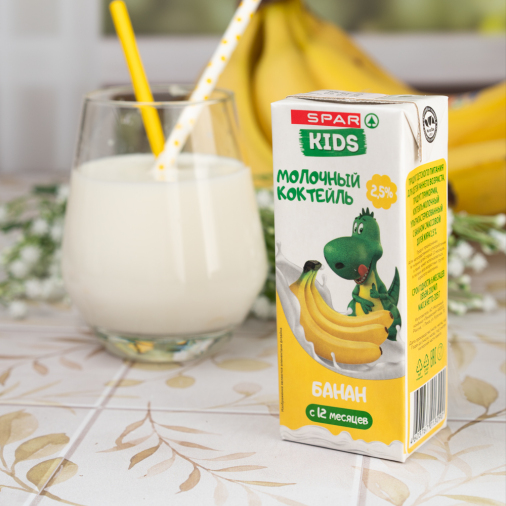 SPAR KIDS это полностью чистый состав и забота о детях. Нежный напиток с банановым вкусом, который порадует маленького сластену! Сохраняет полезные свойства молока и фруктов!