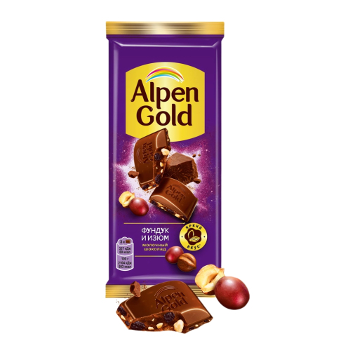 Сахар, изюм, какао тертое, масло какао, сыворотка сухая молочная, молоко сухое цельное, фундук обжаренный дробленный, жир молочный, молоко сухое обезжиренное, эмульгаторы (лецитин соевый, Е476), ароматизатор.