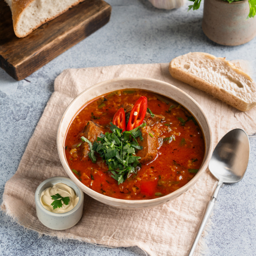 Оцените всё великолепие грузинской кухни, не выходя из дома! Насыщенный ароматный суп с нежной говядиной. Наваристый, густой бульон с рисом, протертыми сочными томатами, чесноком и специями. Только один аромат уже вызывает аппетит!