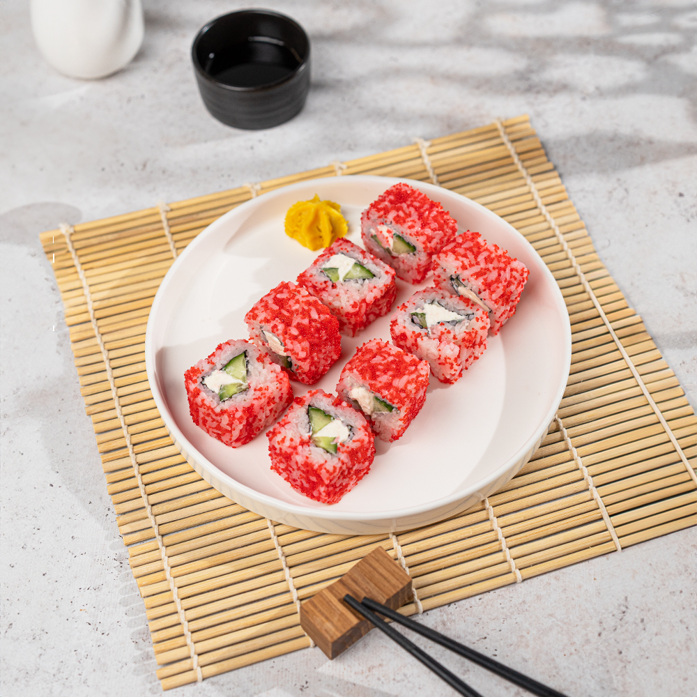 Ролл Филадельфия в масаго — это гармоничное сочетание риса, творожного сыра, огурца, водорослей и икры. Отлично подойдёт как для праздничного стола, так и для уютного вечера. Идеален для тех, кто ценит изысканный вкус японской кухни. Прекрасно сочетается с соевым соусом и васаби. Используется для создания ассорти из суши и роллов.