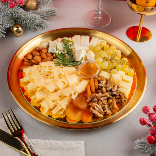 сыр Грюйер 45%,сыр Маасдам 45%,сыр горгонзола с благородной голубой плесенью 50%,сыр мягкий бри President 60%,курага,миндаль,орехи грецкие,мёд,виноград,розмарин