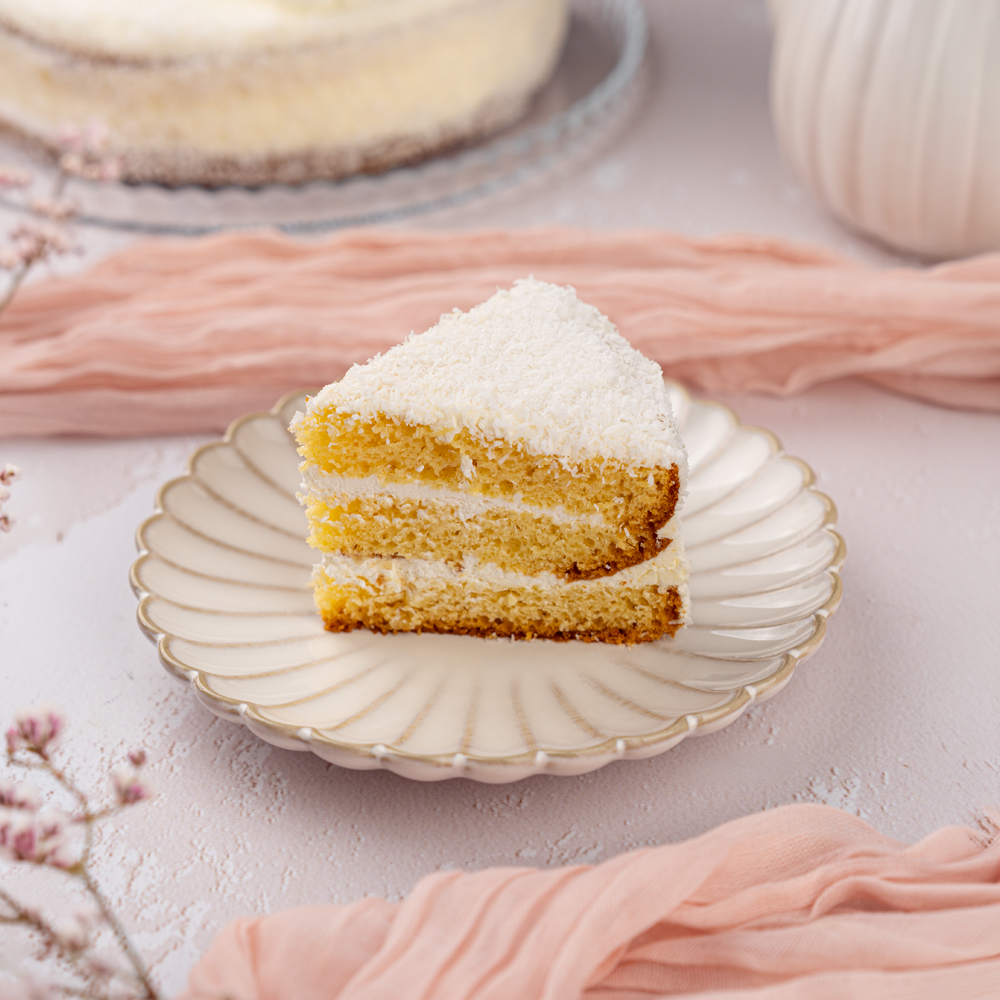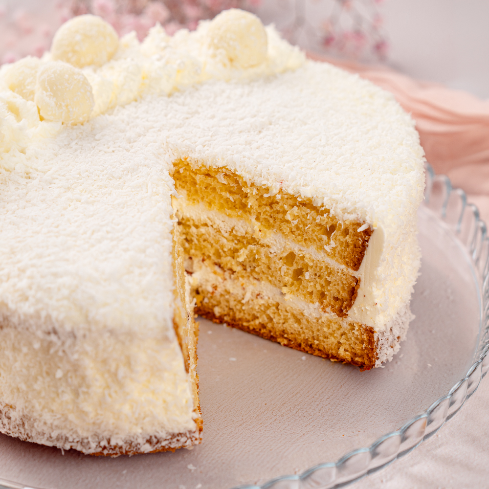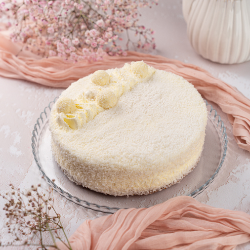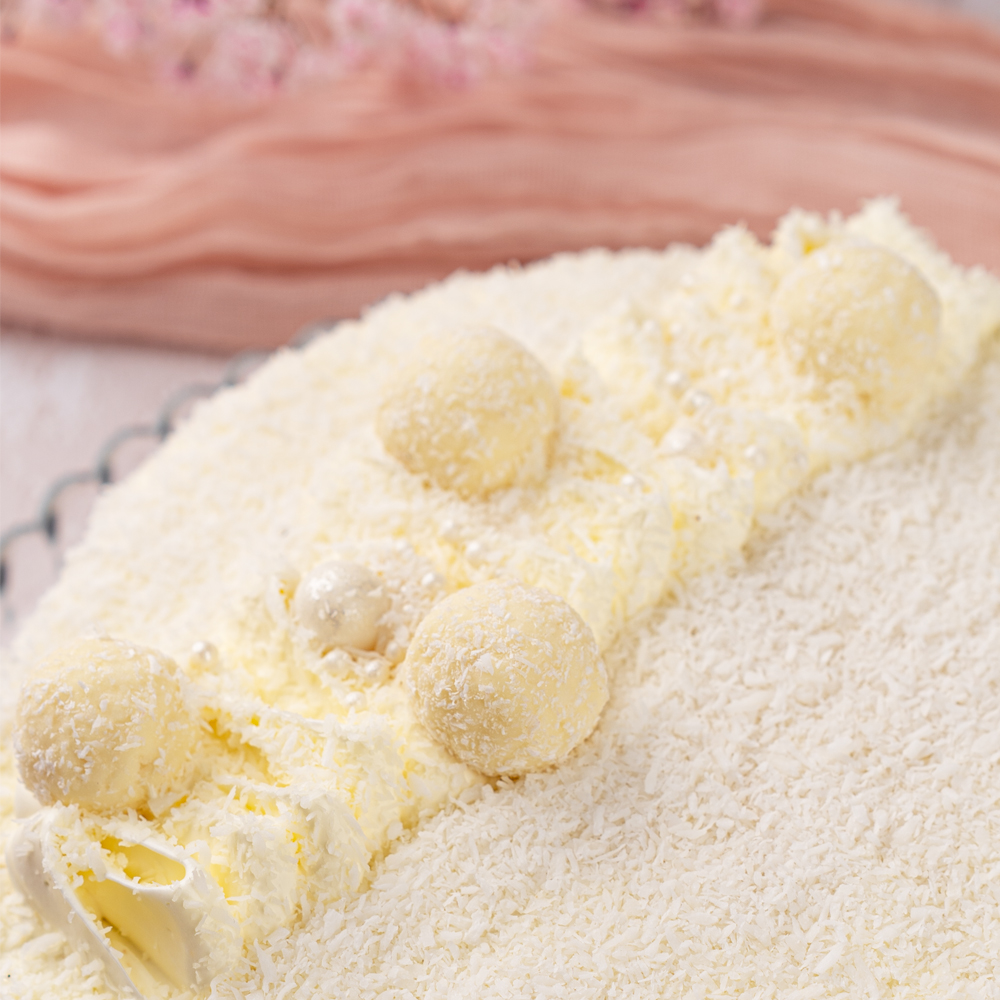 Основа: ванильный бисквит, пропитанный молочным сиропом, сырный крем с миндалем в тертом кокосе. Состав: сахар, меланж, сыр творожный, мука пшеничная, сгущенное молоко, масло сливочное, смесь бисквитная, кокосовая стружка, сливки растительные, масло подсолнечное, конфета кокосовая, миндаль сушенный, маргарин, драже, ванилин, коньяк, ароматизатор, консервант сорбиновая кислота. Может содержать следы арахиса, орехов, кунжута, злаков.