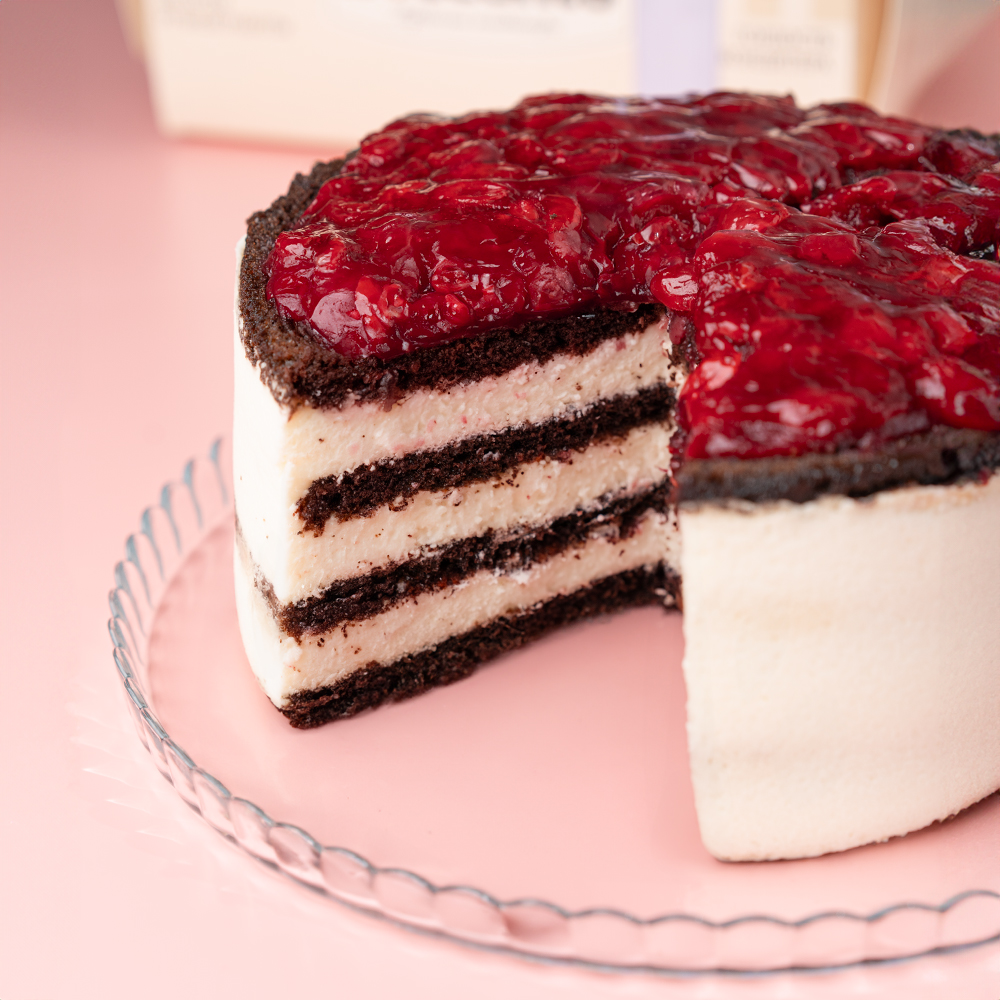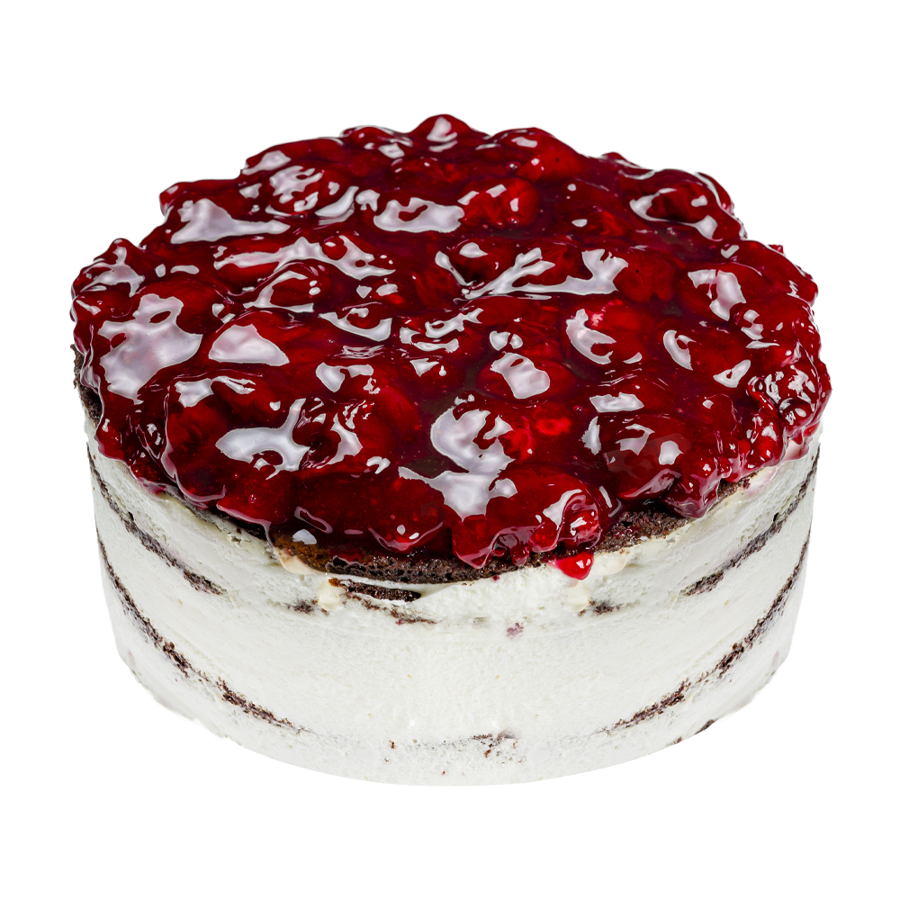Сыр творожный (творог, молоко, закваска, крахмал кукурузный, соль, загуститель, лимонная кислота, вода), масло сливочное 82,5% (сливки пастеризованные), вишня замороженная (возможно наличие косточки), сахар, краситель, сливки 35%, мука пшеничная, яйцо, белок яичный, сахарная пудра, сметана 20%, крахмал кукурузный, желатин, какао-порошок, сода, уксус.