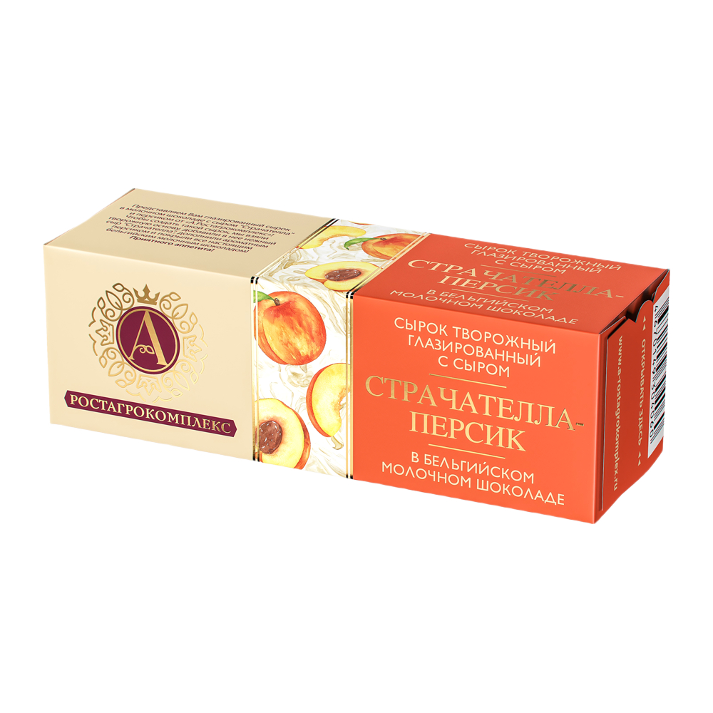 Творог, шоколад молочный (сахар, масло какао, сухое цельное молоко, какао тёртое, эмульгатор: лецитины (соевый лецитин), натуральный ароматизатор: ваниль), сахар, наполнитель «Персик» (сахар, пюре персика из концентрированного пюре персика, вода питьевая, загуститель: пектины, сливки ультрапастеризованные, концентрированный лимонный сок, натуральный ароматизатор, концентрат из моркови, минеральный концентрат молока), масло сливочное, наполнитель с сыром «Страчателла» (вода питьевая, сыр «Страчателла» (сливки ультрапастеризованные, молоко пастеризованное, соль пищевая, сычужный фермент, заквасочные культуры молочнокислых микроорганизмов, регулятор кислотности: молочная кислота), соль пищевая, сахар, загустители: пектины, гуаровая камедь, ксантановая камедь, натуральный ароматизатор, концентрированный лимонный сок, минеральный концентрат молока).