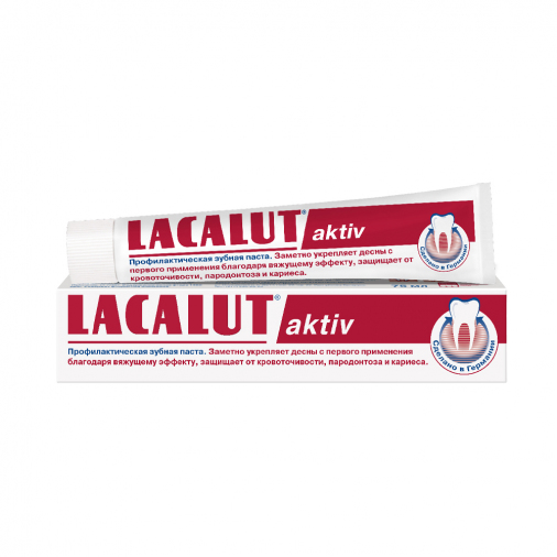 Зубная паста Lacalut aktiv создана для людей, страдающих воспалительными заболеваниями десен: гингивит, пародонтит. Lacalut aktiv содержит антисептик хлоргексидин, который быстро уничтожает большинство бактериальных возбудителей воспаления. Лактат алюминия в составе зубной пасты уплотняет рыхлые десны и уменьшает их кровоточивость. Эффективная и безопасная абразивность зубной пасты позволяет хорошо удалить зубной налет и бактерии с зубной эмали. Фторид в составе пасты укрепляет эмаль и защищает ее от кариеса.