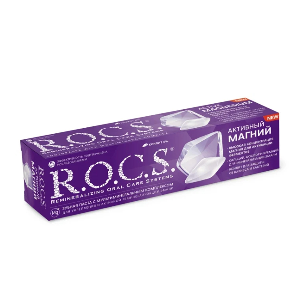 Зубная паста R.O.C.S. Активный магний предназначена для ежедневной гигиены полости рта. Она помогает поддерживать здоровье зубов и десен, обеспечивая необходимый уход. Подходит для использования утром и вечером. Обеспечивает свежесть дыхания на долгое время.