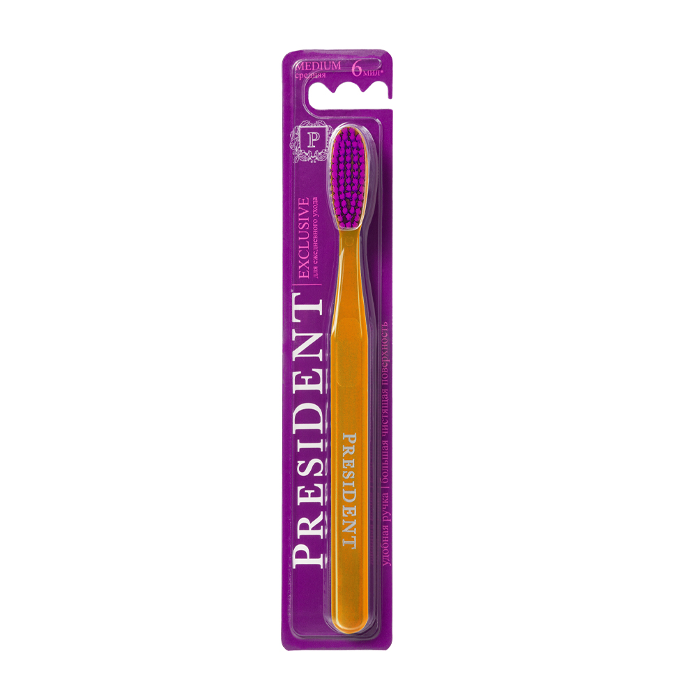 Для тех, кто стремится к идеальной гигиене полости рта, предлагаем зубную щётку President Exclusive. Она обеспечивает эффективное и бережное очищение зубов и массаж дёсен благодаря уникальной форме и особой структуре щетинок. С этой щёткой вы сможете поддерживать здоровье зубов и свежесть дыхания каждый день.