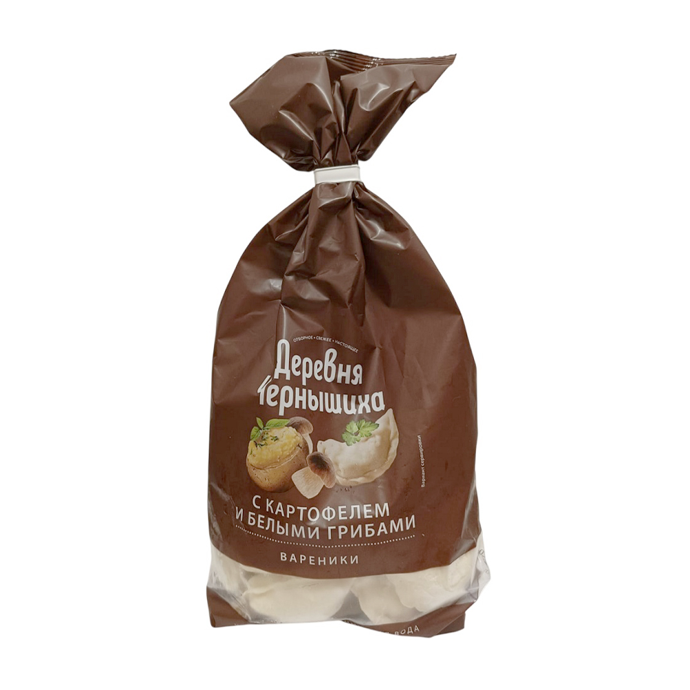Начинка: картофель вареный измельченный (картофель, вода), грибы белые, грибы шампиньоны, лук репчатый, масло растительное, соль, чеснок, перец черный, овощи молотые (грибы, лук, шпинат). Тесто: мука пшеничная в/с, вода питьевая, масло растительное, соль.