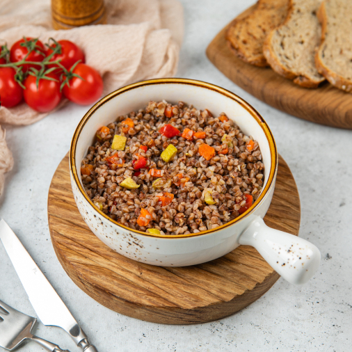 Каша гречневая с овощами по-купечески — готовое второе блюдо, которое подойдёт для быстрого и сытного обеда или ужина. Идеальна для тех, кто ценит время и вкус. Подавайте как самостоятельное блюдо или дополните мясными добавками. Легко разогревается в микроволновой печи. Отличный выбор для насыщенного дня.