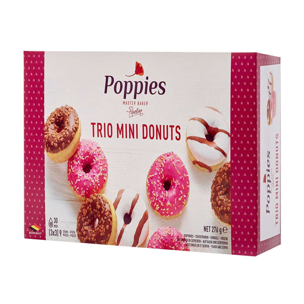 Мини-пончики Poppies Трио — это идеальное лакомство для сладкоежек всех возрастов! В упаковке вас ждут три вида нежнейших мини-донатов, покрытых ароматной глазурью разных вкусов: ванильной, шоколадной и карамельной. Эти миниатюрные пончики станут отличным дополнением к чашечке кофе или чая, идеально подойдут для перекуса или праздничного стола.