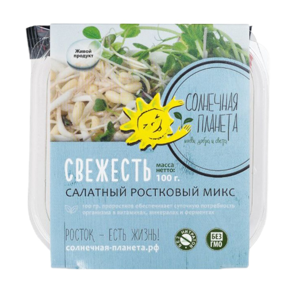 Салатный микс из проростков фасоли маш, микрозелени гороха, редиса, подготовленных ядер подсолнечника и льна.
